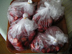 とりあえず追加分のイチゴのヘタをとって砂糖をかけておく。イチゴ500g+砂糖250gが5袋。