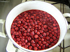 ヘタとって、ポリ袋に入れて、重さの半分の砂糖を入れて一晩放置します。水分が出たところで、袋の口をあけて電子レンジにかけ、ジュースと果実を分けます。