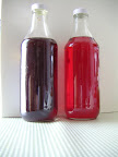 出来立てはきれいな赤色だが、時間をおくと色が濃くなっていく。写真の左は去年のシロップ。右の色の明るいのが今年のシロップ。