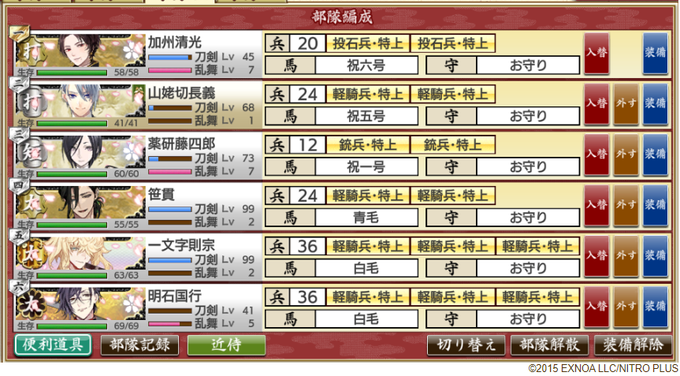刀剣乱舞の今の推し刀部隊。太刀たちがやる気なさげでフリーダムなので、打刀が苦労しそう。薬研さんは手伝ってくれるけど、基本面白がって見てる気がする。